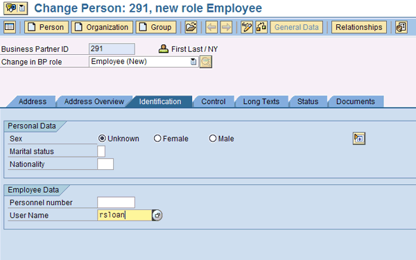 Press Enter and then click the Identification tab. On this tab, enter the user ID in the User Name field (Figure 7). To process messages in the Service Desk, the business partners must have an employee record. The other data is copied from the general role already created in the last step. Click the save icon and you’re done with this step.