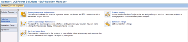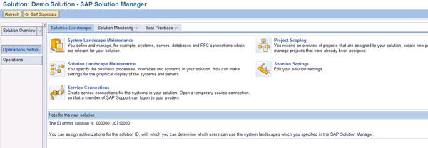 To set up the solution, use transaction SOLUTION_MANAGER. In Figure 1, you see the Solution Overview screen. It shows the solutions that have already been created in SAP Solution Manager and their current statuses.