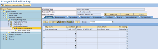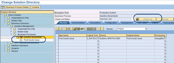 Step 8. The approving authority logs into SAP Solution Manager and clicks the Check out button (Figure 17). This copies the content of the business process from the solution to the maintenance project and updates the status to Checked Out. Note the red check-out icon