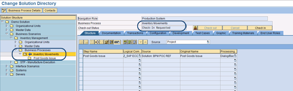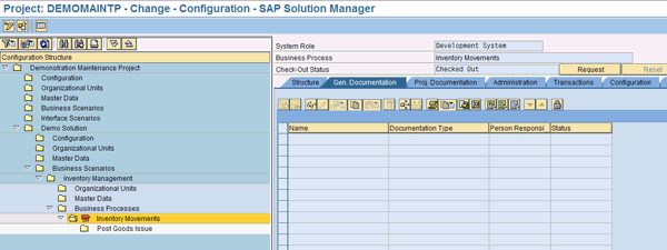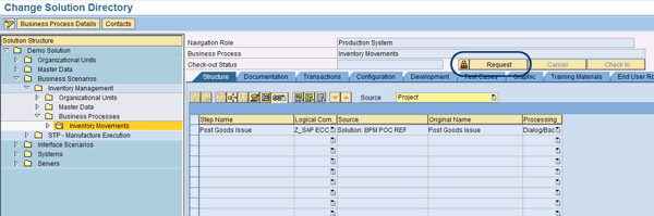 The first step is to check out the business process affected by the change. This copies the process documentation from the solution and places it into the maintenance project. SAP Solution Manager provides this functionality in a multi-step process so you can enforce approvals and segregation of duties. It starts by requesting the check out on the solution. To request a check out, follow these steps: