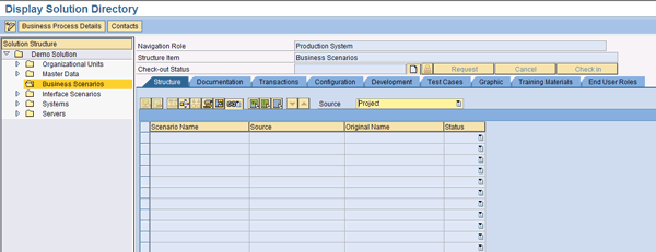 in the Solution Structure on the left side of the screen to navigate to the Business Scenarios section. Here, you can import a business scenario from your project. Figure 5 shows the tree expanded to the point where you can add the scenarios with the Structure tab selected. Note that the Source field defaults to Project; this allows you to get the finished scenarios from your implementation project.
