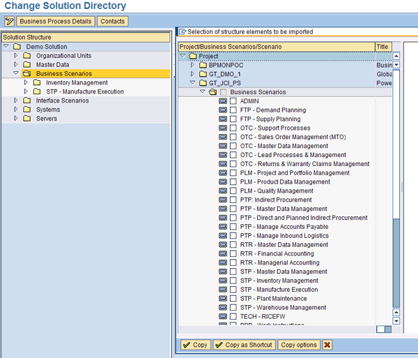 When you click the Copy button, the business process structure and the content from the project are brought into the solution. For this example, I selected two scenarios: Inventory Management and STP – Manufacture Execution. The scenario you choose does not affect the processes I’m covering in this article. Now that you’ve set up your solution and added your scenarios, you can create and assign the maintenance project.
