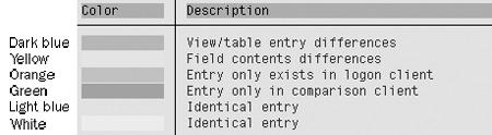 SAP R/3 also uses different colors to identify what type of difference exists between the systems, as shown in Figure 7.