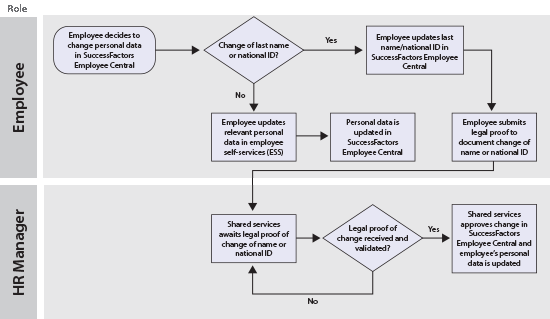 Figure 1 shows a sample global process for an employee who needs to change personal data in the SuccessFactors system. All actors in the process are documented (the employee and HR manager roles) as well as what each role does in the process.