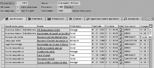 R/3 refers to the repository of all the data you wish to track for an employee as a qualifications catalog. Determining what data you want to store is the first step toward building your qualification groups and catalog. You can select individual criteria including qualifications, preferences, potential, designations, dislikes, and career goals. Or you may combine them as you wish. This catalog is structured hierarchically on the basis of qualification groups. For example, if you have a qualifications group called “languages,” the qualifications under that group might be English, Russian, and Italian. Determining what data you want to store is often a challenge. There is no global set of qualifications that all companies share. Beyond some basic similarities, each company usually wants to track qualifications that are unique to its business. Taking it a step further, you may want to track different qualifications for different employees in your company. For example, you could create a technical skills qualification group containing skills such as Visual Basic, ABAP, COBOL, or SQL.