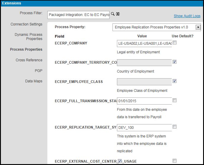 You also have to set up the Process Properties for each of these processes. During this step, you assign the different selection criteria to extract the data from Employee Central for replication to the SAP ERP HCM on-premise system. Click the Process Properties option on the left of the screen in Figure 2, and the screen shown in Figure 3 opens. Here you can select the criteria for data extraction by the Legal Entity, Country, or Employee Class of the employee. You also need to assign the full transmission start date, which is usually the go-live date for the implementation. This is the date used to determine what data needs to be fed over to the SAP ERP HCM system. In Boomi, follow these steps: click Manage > select Atom Management > double-click the appropriate Environment > select Environment Extensions.