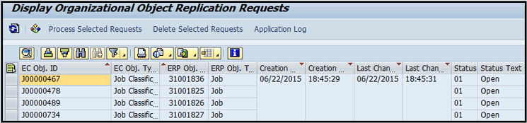 In Figure 9, you can see the job codes from Employee Central (in the EC Obj. ID column—J00000467, J00000478, and so on) are in the process of getting replaced. Note that the organizational replication request tables are in Open status. This means that the replication request hasn’t been processed and is waiting for the report to run to trigger the replication.