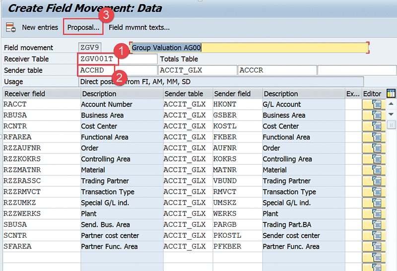 To create a field grouping code, follow menu path Financial Accounting > Special Purpose Ledger > Basic Settings > Master Data > Maintain Field Movements. This path takes you to Figure 10. In this configuration, the required dimensions (fields) from the sending application need to be assigned to the receiving application. Select the Create Field Movement option to create the new field grouping code. In Figure 10 enter ZGVOOIT for the Summary table as a receiver. In the Sender field, enter table ACCHD (Interface to Accounting: Header Information). By selecting the option Proposal, the system suggests the possible dimensions that can be transferred from the sender table to the receiver table. If the system proposal does not match the business requirement, the sender and receiver dimensions can be entered manually.