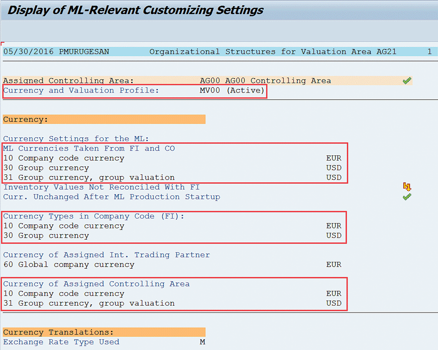 Figure 12 shows the Material Ledger settings and a comparison of currency settings with FI. Note that the Material Ledger is active with multiple valuations using the valuation profile assigned to CO. The Material Ledger has legal valuation in local (10) and group currency (30) and group valuation in group currency (32). Currency settings in the FI application have only local currency (10) and group currency (30). The report also shows that the inventory values in the Material Ledger cannot be reconciled with values in FI because the group valuation is not available in FI.