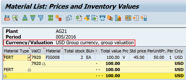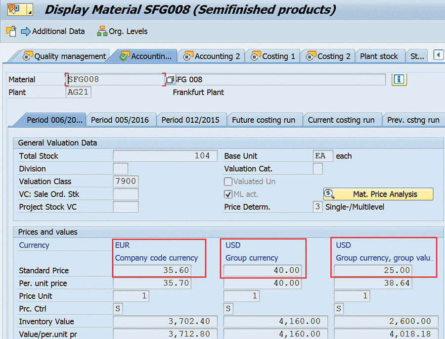 A multiple valuation approach in the Material Ledger provides the value of goods in three different views in two different currencies—profit center view, legal view, and group view.