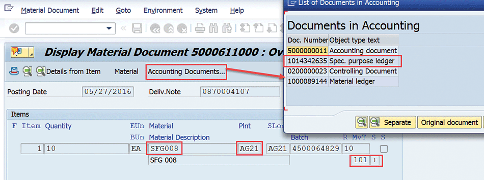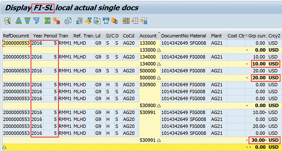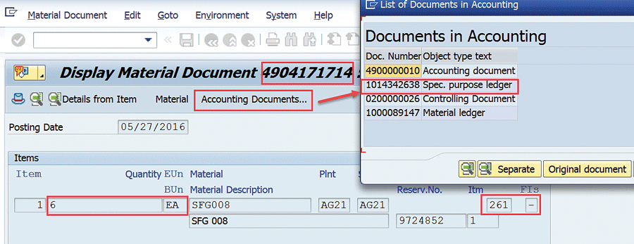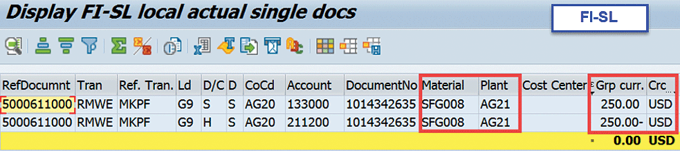 The Special Purpose Ledger has been configured to receive postings from any goods movements. As per the test scenario, the semi-finished material SFG008 is used to produce the finished good FIG008 through a production order. The semi-finished goods were issued against the production order using transaction code MIGO. The goods issue creates the corresponding material document. The list of accounting documents is shown in Figure 19.