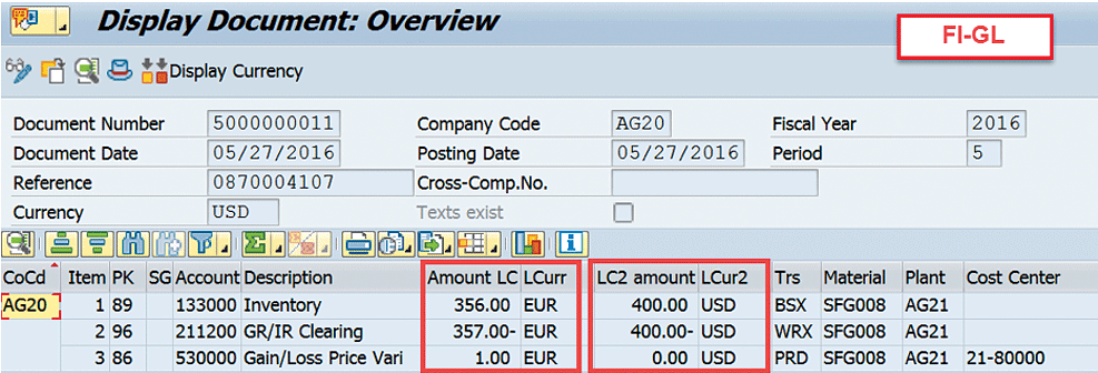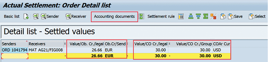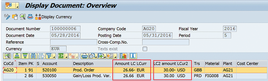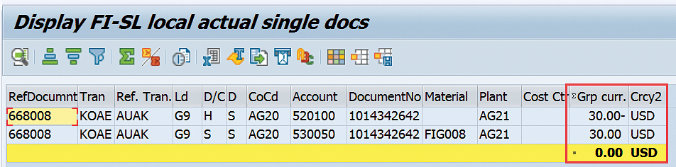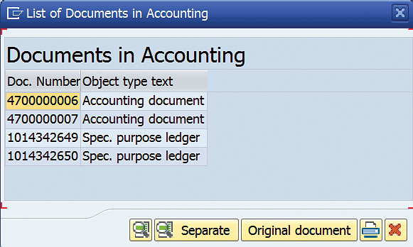 As shown in Figure 26, the variance settlement creates an accounting document in the SAP General Ledger for legal valuation in both legal and group currencies. You can access the details of the accounting documents by clicking the Accounting documents button, highlighted in Figure 25.
