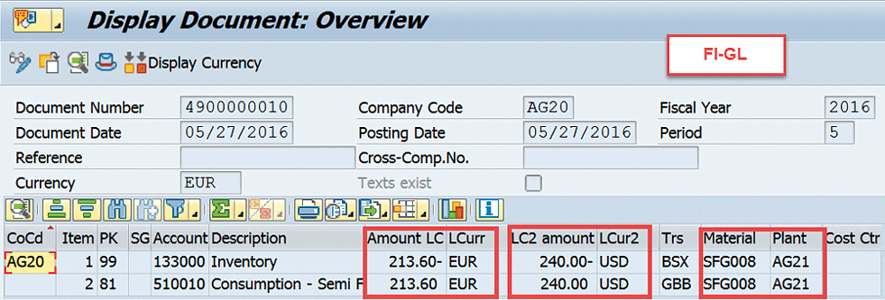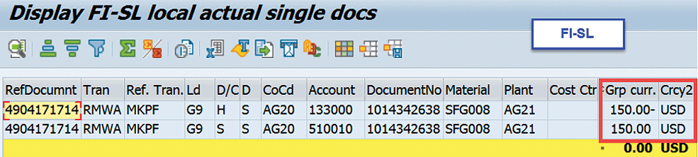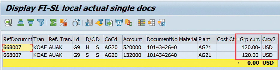 As expected, the accounting document in the SAP General Ledger only has the values of Legal valuation and Group currency. A view of Group valuation is available only through the Special Purpose Ledger document. This characteristic of the Special Purpose Ledger is applicable for cost objects-process orders, product cost collectors, and CO production orders as well.