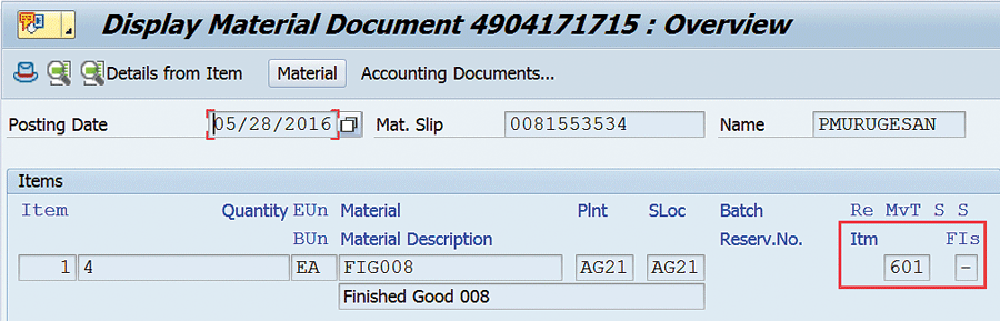 The warehouse team performs the steps to deliver the goods to external customers, which creates the corresponding material and accounting documents. The material documents are available in the document flow of the delivery document, which can be accessed throuh transaction code VL03n. The goods issue to external customers behaves the same as a goods issue to a production order or a goods receipt against an STO as discussed earlier. It creates the same set of accounting documents in the SAP General Ledger and the Special Purpose Ledger. The details are available in Figures 28, 29, and 30. These documents support the revaluation of consumption process during the Material Ledger closing.