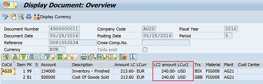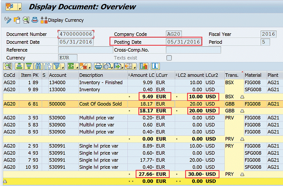 The details of the accounting document posted in the SAP General Ledger from the Material Ledger closing can be accessed by clicking the Closing Document button in the Material Ledger report. The details of the accounting document are provided in Figure 35. Note that the Inventory - Finished goods 134000 has been posted with the portion of the total variance allocated to get the actual inventory value for legal valuation in the company code currency and group currency. Likewise, the Cost of Goods Sold account 500000 has been posted with the variance allocated to generate the actual cost of goods sold.