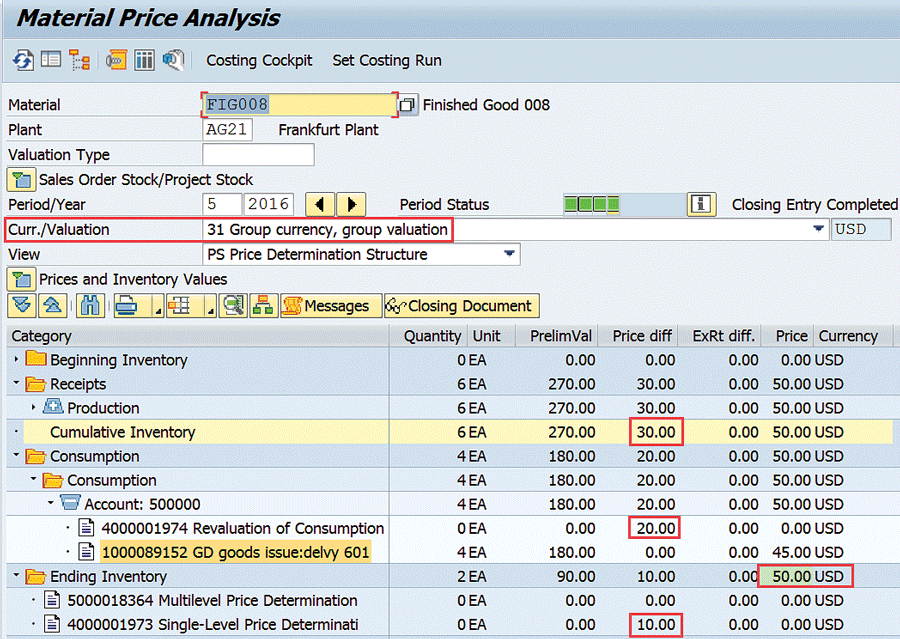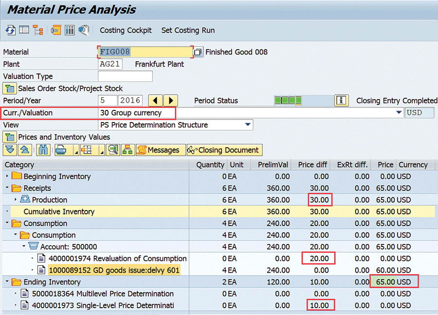 In the Material Ledger report for Group valuation in the group currency (Figure 33), the total variance of 30.00 USD has been split to consumption (20.00 USD) and ending inventory (10.00 USD).