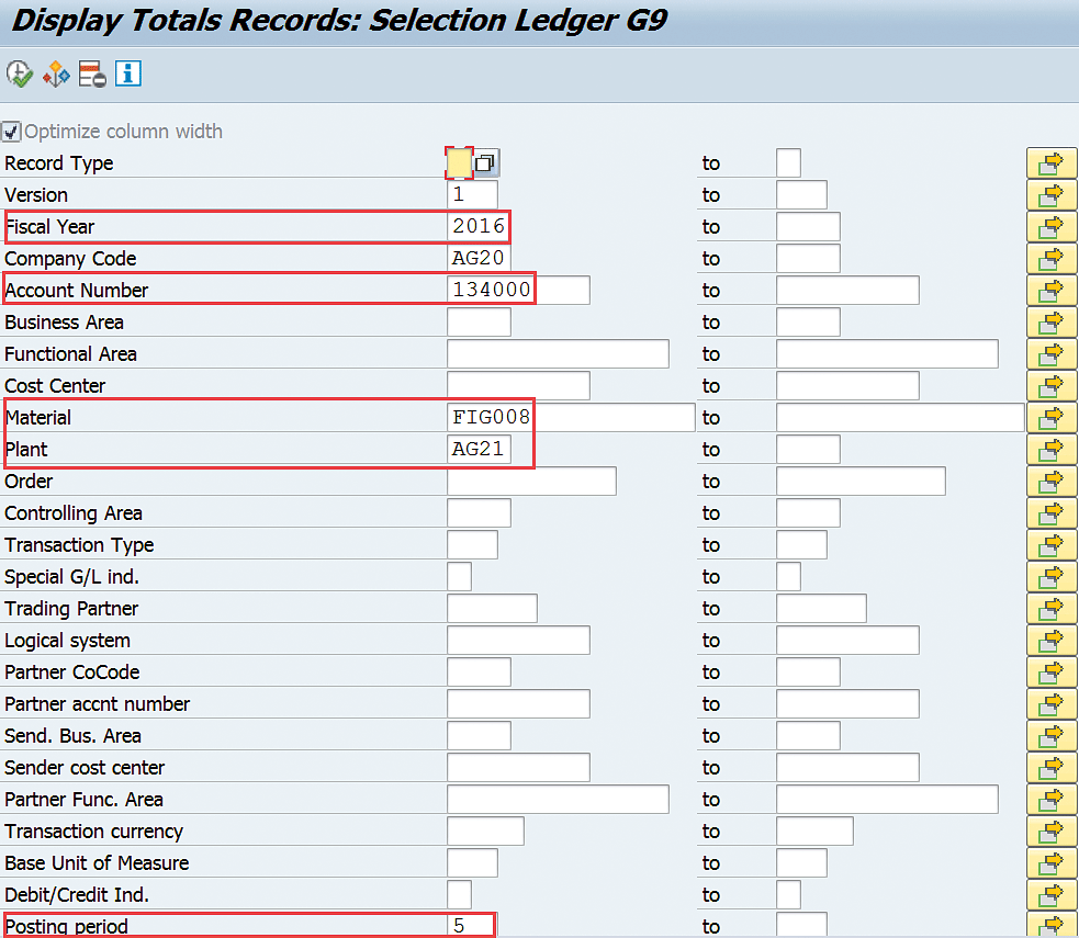 Similar to the Material Ledger, standard reports are available in the Special Purpose Ledger to check the balance on inventory accounts. The reports can be accessed through menu path SAP Easy access > Accounting > Special Purpose ledger > Actual Posting > GD13 - Display Totals (Figure 39).