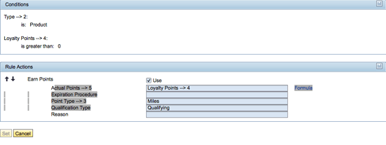 Activities that a member can perform for operating various transactions (e.g., earn points, buy points, and redeem points) are supported by loyalty management processes. You can create roles for each of the activities in the loyalty program using the LOYPRO business role. The rules to earn, buy, and redeem points have conditions and actions as follows.