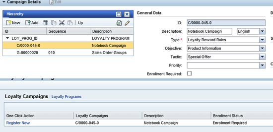 The loyalty engine executes the rule actions when a member activity fulfills the defined conditions. The reward rules are integrated with marketing campaigns for registration and enrollment. Marketing segmentation is also defined for loyalty-specific attributes or target members for tracking member activity over a period of time. A campaign is created for the target group of customers that can register for the program, and it has rules assigned for the campaign (Figure 9). Members can enroll in the CRM WebClient UI as shown for the Notebook Campaign in Figure 9.