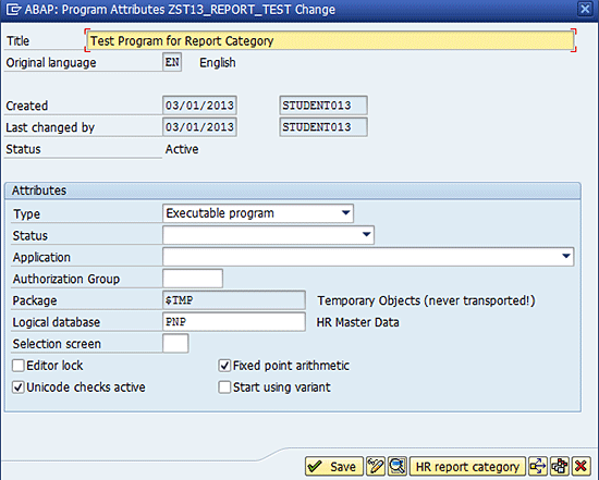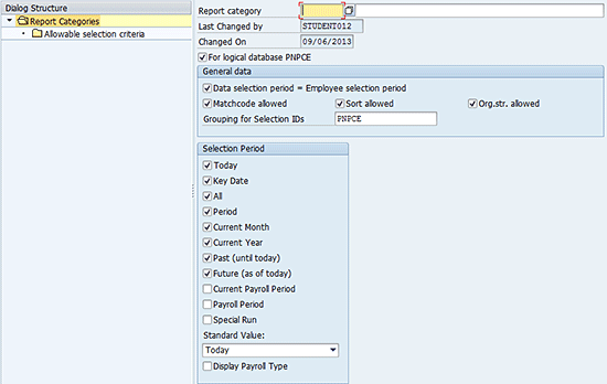 The logical databases PNP and PNPCE provide default screens with a set of commonly used input fields. However, in certain circumstances, these screen fields may not suffice. Users may want you to either hide or add certain fields for data input. You can use report categories to complete this task. SAP ERP HCM report category provides a number of flexible options (without the need of coding) for designing the report selection screen and displaying output pertaining to the data entered by the user.