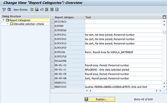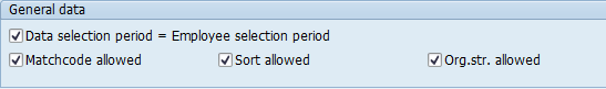 The report category enables you to add a number of additional fields to the program selection screen. In addition, you can also simplify the look of the screen by removing existing fields, such as company code, employee group, and subgroup. These changes do not affect the coding of the programs to which the categories are assigned.