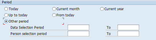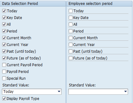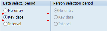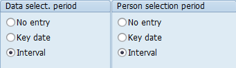 However, if you want to separate the data selection and the employee selection periods, do not select the Data selection period = Employee selection period check box (Figure 7). In this case, if you select the Interval radio buttons for both the Data select. period and the Person selection period (as shown in Figure 11), then the PNP selection screen appears (Figure 12).