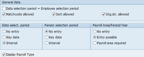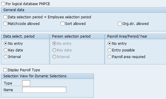 Now you put into practice all the concepts discussed previously. You have created a new report category for the PNP logical database. You have unchecked all the indicators in the General Data section. In addition, in this example, the No entry radio buttons are selected for Data select. period and Payroll Area/Period/Year (Figure 20).