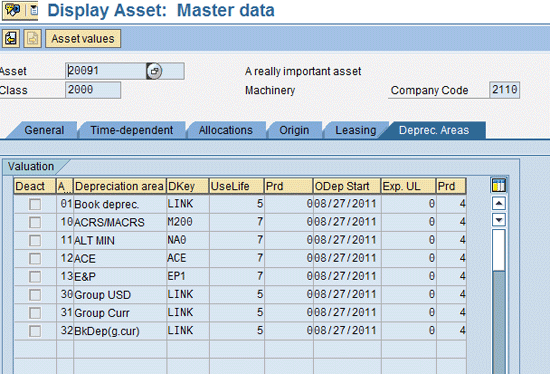 When you assign a chart of depreciation to a company code, all depreciation areas defined under that chart of depreciation become available for managing parallel values of the fixed assets that belong to that company code. SAP recommends that you define all depreciation areas you might need before the system goes live and manage these depreciation areas on your assets in your production system.