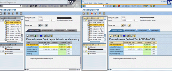 You can display parallel asset values using transaction code AW01N. Figure 3 illustrates that for an asset, different depreciation methods result in calculation of different planned depreciation amounts. The session on the left shows asset values for the book depreciation area. The session on the right shows asset values for the tax ACRS/MACRS depreciation area.