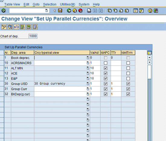 Parallel currencies in FI-AA are usually implemented for group consolidation purposes. In this case, the depreciation method and the acquisition cost are the same for group GAAP and local GAAP. SAP provides a solution to enable a scenario in which a company has the same depreciation method and acquisition cost both for the local currency and group currency. Before I discuss this solution, note that to manage parallel currencies in FI-AA, you need to complete the following configuration steps before you can assign a chart of depreciation to the company code.