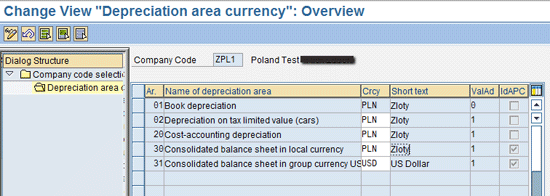 To illustrate a parallel currency scenario with different local and group currencies, I use an example of another company code in which local currency Polish zloty (PLN) and a parallel currency USD is defined in FI. The parallel currency is a group currency type, and a legal valuation is specified. For a company code set up this way, you define currency specifications in FI-AA as shown in Figure 7. Note that the IMG menu path is the same as in the earlier step except the currency settings are different.