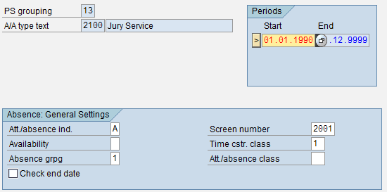Variant A is defined for Friday and Variant B is defined for any day other than Friday. This means that when you try to record absence data via infotype 2001, the default working hours are indicated as variant A/B. If the recording day is Friday, the absence hours are eight (which come from variant A). If the recording day is on a day other than Friday, the absence hours are six hours (from variant B). The next important step is to assign the absence type to the appropriate grouping.
