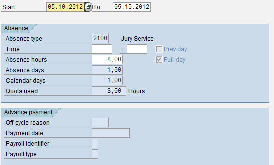 When you record an employee’s absence day in infotype 2001 (absence), the SAP ERP HCM system automatically refers to the planned working hours in the relevant daily work schedule to bring the absence hours from the related daily work schedule. Therefore, when you put a full-day absence into infotype 2001, the system automatically brings the employee’s working hours from the daily work schedule. The result is if the employee is absent for a full-day, his or her absence hours are the same as his or her daily work schedule.