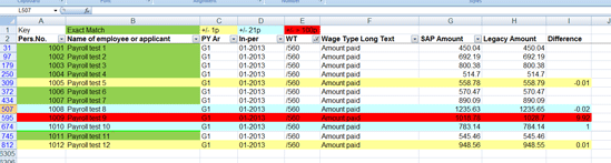 Net pay amounts are compared by setting a filter on column E (WT– wage type) so that only the chosen net pay wage type (in this case /560 Amount paid ) is shown for all employees. The SAP system amount is shown in column G (SAP Amount), next to the legacy amount in column H (Legacy Amount). Any difference is calculated in column I (Difference). The VBA routine is used to color code the cells according to the magnitude of difference. The Key to the different colors is given in the top row: Green is for an Exact Match, yellow is for a one pence (or a one cent) rounding difference, light blue is for a 21 pence (or 21 cents) target tolerance, and red is for any difference greater than one pound sterling (one dollar).