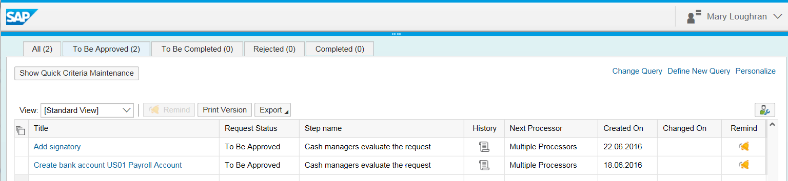 Next, the workflow approval process is triggered to obtain the approvals for the new bank account, as is shown in Figure 12.