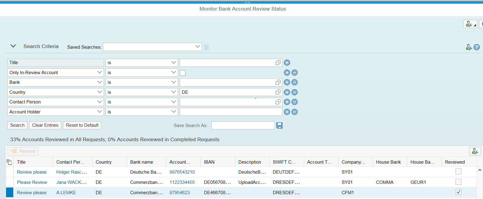 Prior to using SAP’s Bank Account Management, the annual review process was done by email with no built-in audit trail, and standard SAP reporting was not available. It was important that the process of annually reviewing the active bank accounts was incorporated into workflow, with an audit trail. Now with SAP Cash Management powered by SAP HANA, SAP workflow is used, and with SAP HANA, the workflow can go to either the business user’s company email account or the SAP workflow messages through Business Workplace (transaction code SBWP). As part of the annual review process, the person or people in charge of each account is reviewed, as well as the authorizers on each account. In addition, the active accounts are reviewed to ensure the accounts should remain in place. Fee analysis was not a high-priority factor at that point in time for this customer. (As mentioned above, the Bank Account Management does not support fee analysis.) Prior to using Bank Account Management, this customer did not have a secure system in which to store bank account information centrally.