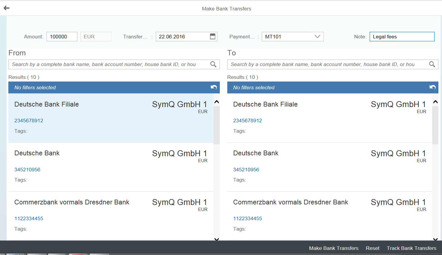 There is also a Make Bank Transfer app, which is a fast way to make a transfer payment from one bank account to another. This is similar to running Bank-to-Bank Transfer (transaction code FRFT_B) on ECC. With the Make Bank Transfer app, shown in Figure 5, you enter an amount, value date, payment method, and reference text at the top of the screen. Select the source and target bank accounts by clicking the bank accounts and then clicking the Make Bank Transfers button at the bottom of the screen. Because SAP is an integrated system, when the payment is saved, it is immediately reflected in the Cash Position report.