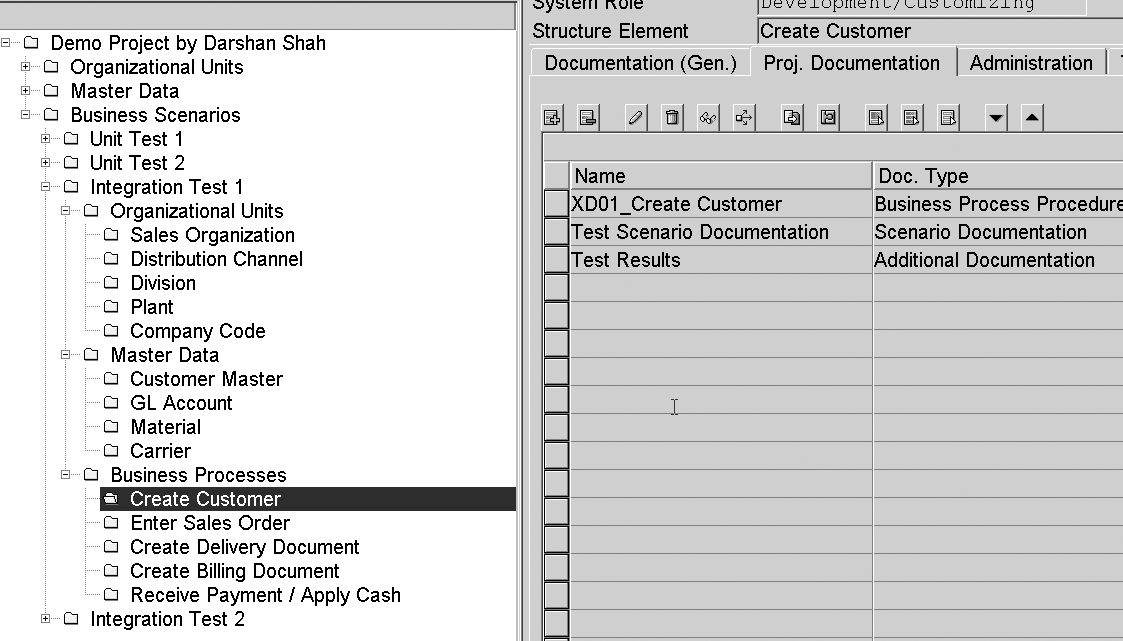 In this structure, you can store documentation, assign transactions to nodes, and use them later during realization to access the SAP system from within Solution Manager. Each substructure item under the Organizational Units, Master Data, or Business Scenarios is called a node. For example, in Figure 4, I have assigned transaction code VA01 to node Create Sales Order under Business Scenarios. This allows me to execute VA01 from within the Solution Manager.