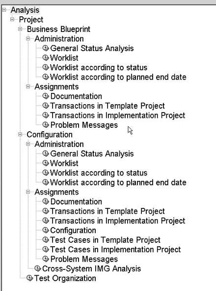 As shown in Figure 7, the Project Analysis feature has a prebuilt reporting structure to generate project management reports. We ended up using the Documentation node a lot for analyzing the status of documents stored in Solution Manager.