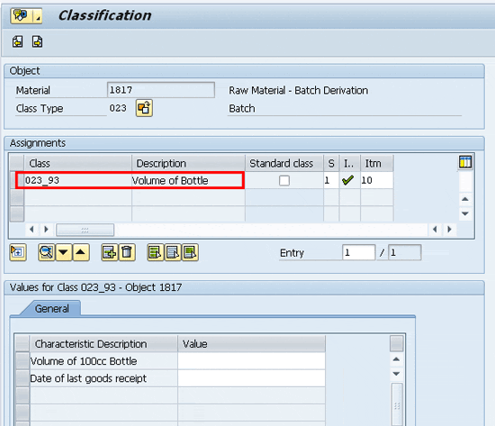Figure 1 consists of a Class 023_93 of Class type 023 (Batch) and has two characteristics whose descriptions are given as Volume of 100cc Bottle and Date of last goods receipt, respectively. On this screen, you only need to assign an already-created class, which in my example is 023_93. After you assign an already-created class, the system automatically assigns the characteristics associated with it. In my example I do not have to assign any specific value to the characteristics (in the value column) because I do this during the transactional data entry. Click the save icon or press Ctrl S to save your entries. For more information on class and characteristics, see the sidebar “Classification: Class with Characteristics.”