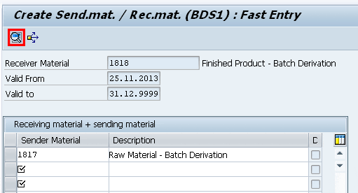 Next, I enter the sender material number 1817 in the lower half of the screen. In this section of the screen, you can enter multiple sender materials for one receiver material. Select the sender material 1817 and click the details icon.
