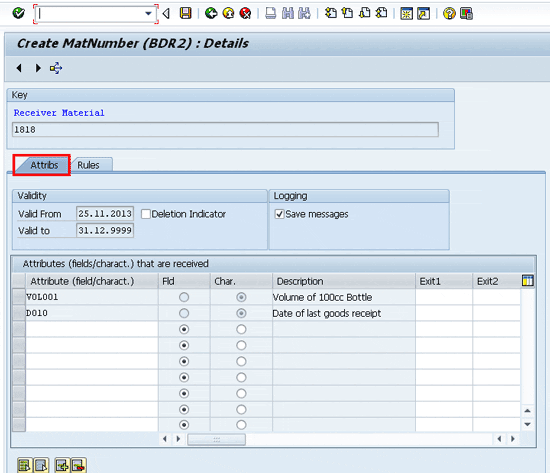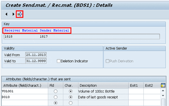 The next screen (Figure 5) consists of details not just about the sender material 1817 but also receiver material 1818. Enter the two characteristics VOL001 and D010 in the lower half of the screen. This data tells the system to send the characteristic values of these two characteristics from material 1817 (the sender material) to 1818 (the receiver material). These are the same characteristics that you previously maintained in the classification view of material masters 1817 and 1818 (Figure 1).