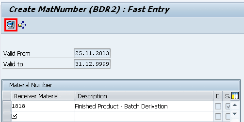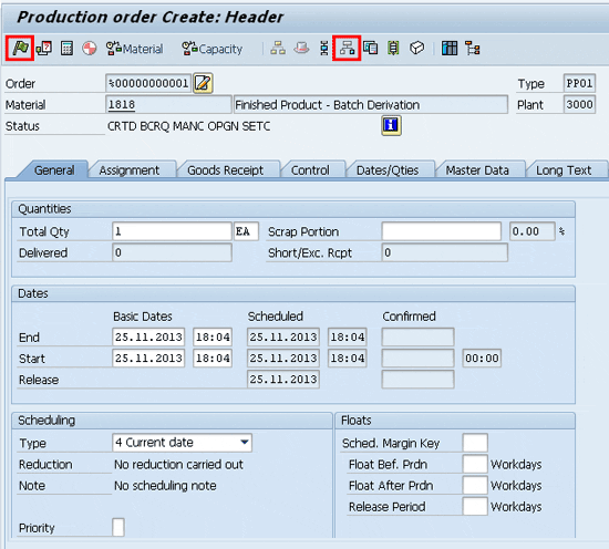 In the screen shown in Figure 17, which is a section of the Goods Receipt tab of the screen shown in Figure 15, click the new batch icon (the plain white icon) so that the system is able to create a new batch for the receiver material (1818). In my example, it created batch number 0000000409. Next, click the second icon, which is for batch derivation (the icon to the right of the white icon shown in Figure 17). Because all batch derivation settings are correctly in place, the system does not issue a message. Had there been any inconsistent batch derivation settings, the system would have either brought up a warning or an error message. Save the production order by clicking the save icon. In my example, the system generates production order number 60003610.