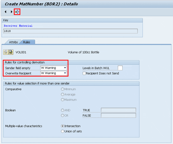In the next screen (Figure 10), you can define the rules that the system needs to follow in case it is unable to perform batch derivation. You need to define the rules for every individual characteristic. In my example, I set the rules for first characteristic VOL001 in which I set the control level to warning in case the system finds the sender field empty. An empty sender field means that there’s no characteristic value in sender material’s classification, and therefore, nothing transfers to the receiver material during batch derivation. You can also turn these warning messages into error messages if you want to ensure that the user handles batch derivation-related issues as soon as an error message appears. The second control setting for the same characteristic VOL001 stipulates how the system reacts if it is able to previously find an already-entered value in the characteristic. If it is to overwrite this characteristic, you can indicate whether the system overwrites the characteristic with a warning message or brings up an error message that does not allow overwriting.