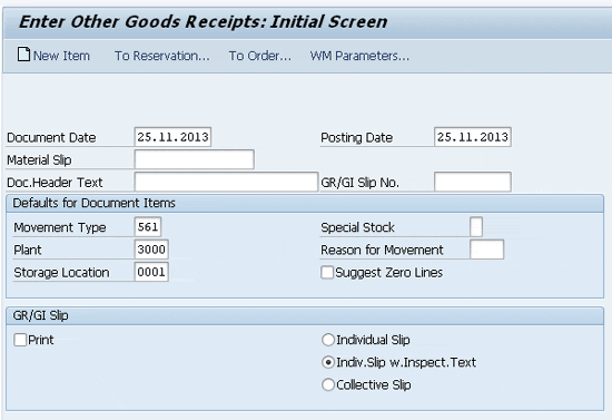 For my example, I use the option to increase the sender material 1817 stock by using the direct quantity increase option using movement type 561 and without reference to any purchase or production order. To perform goods receipt for the sender material using movement type 561, follow menu path Logistics > Materials Management > Inventory Management > Goods Movement > Goods Receipt > Other or use transaction code MB1C (Figure 11).