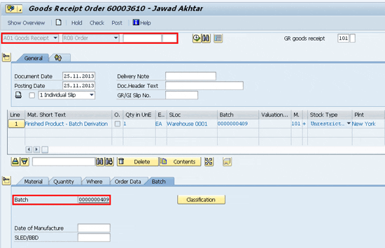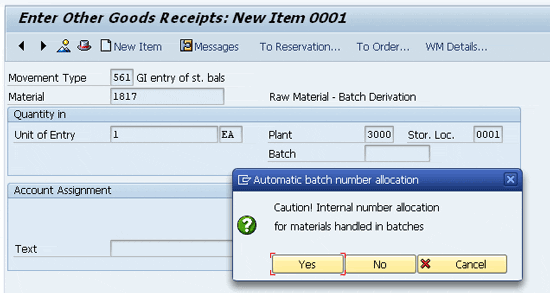 Although you have various ways of posting a material receipt in the system, such as posting a goods receipt against a purchase order or against another production order, the objective of this step is to increase the sender material’s inventory and at the same time manually incorporate the characteristics values that are then used with batch derivation.