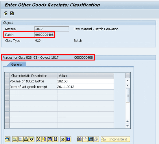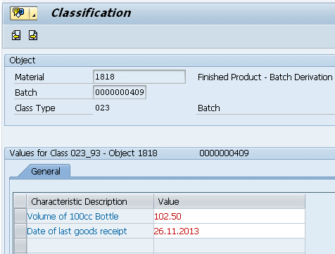 In the next screen (Figure 13), the system creates the batch number 0000000408 and assigns it to material 1817, having batch class 023_93 with the same two characteristics that you saw in Figure 1. Manually enter the values of the two characteristics (VOL001 and D010, respectively) as 102.50 and 26.11.2013 (November 26, 2013). To save your entries click the save icon or press Ctrl and S.