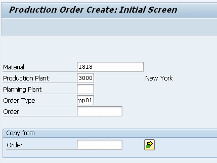 To create a production order, use menu path Logistics > Production > Shop Floor Control > Order > Create > with Material or use transaction code CO01. In the next screen (Figure 14) enter the sender material number 1818, the plant 3000, and the order type pp01 and press Enter.