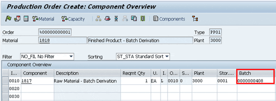 The next step is to create a production order for the material 1818 (the finished good) in which the system automatically assigns the material 1817 (the raw material) as its component. Assign the specific batch number 0000000408 of the material 1817 (as in Figure 13) and then perform batch derivation. In this way, the characteristics values of the sender material’s (1817) batch number 0000000408 automatically send copies to receiver material (1818) during batch derivation.