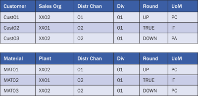 These tables are used to look for customer-specific rules (or generic business rules if there are no customer-specific rules), to change quantities in the sales order. Those changes streamline the sales order or logistics. Sales organization, for example, is a generic high-level element in a sales order fulfillment process, while custom ship-to is a detailed element in this process. You can configure business rules at different levels to manage orders in a more systematic manner (e.g., you could have customer exceptions starting at the customer-sales area level and then look for exceptions at the material-plant level).